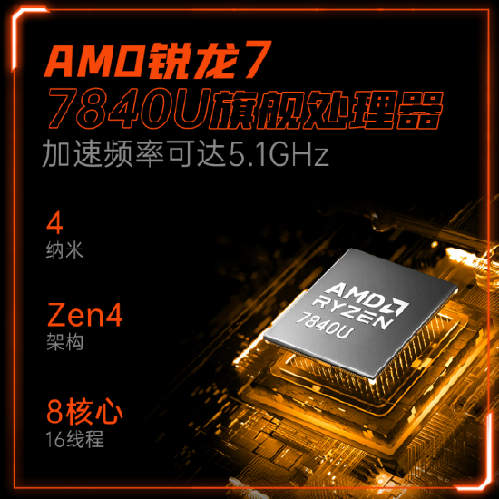 OneXPlayer飞行家F1搭载了最新一代的AMD 锐龙7 7840U处理器,采用Zen 4架构,8核16线程,最大加速频率5.1GHz;配备采用RDNA3架构的Radeon 780M核显,频率可达到2.7GHz,其卓越的计算能力和图形性能,能够为玩家们带来更流畅、更逼真的游戏画面。