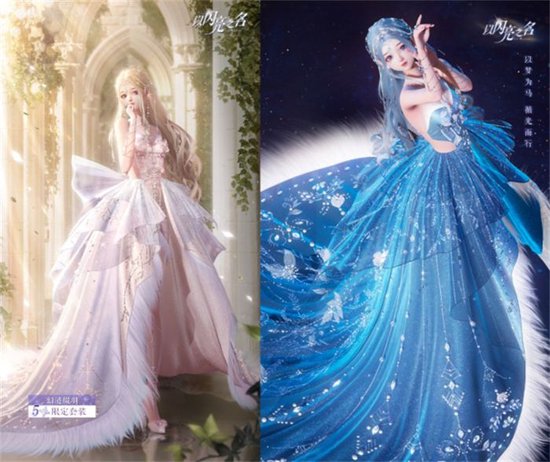 而此次推出的另外一套五星套装「幻涟缀羽」则更加现代和梦幻。华丽的拖尾大裙摆结合柔软的羽毛裙边,看上去贵气十足。衣身和裙摆上的透明立体花、羽毛元素,裙摆上用亮片水钻珠串拼合而成的藤蔓纹样,锦绣华美,更为整套服装增添了几分优雅和华丽。