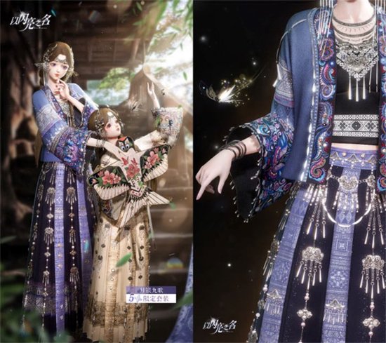 此次《以闪亮之名》的梦洲笙歌全新版本,最惹人注意的是来自东方传统文化和元素的五星套装——「月银九歌」。该套装灵感取自东方传统文化中的美好与吉祥,以花鸟纹刺绣、清新娟秀的百褶裙和精致大方的小开衫配吊带作为主体,紫色、蓝色和端庄黑色的整体搭配灵动神秘感十足。长命锁,孔雀,百合花,云边锁等具有美好象征意义的元素,通过银质的装饰,完美点缀在套装上。