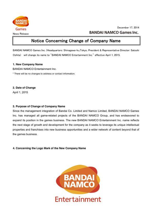 2014年12月17日,万代南梦宫(Bandai Namco Games)发布文件,文件中披露万代南梦宫将再次更名。根据该文件内容,万代南梦宫的名称由目前的Bandai Namco Games变更为Bandai Namco Entertainment,新名称将于2015年4月1日起正式执行。