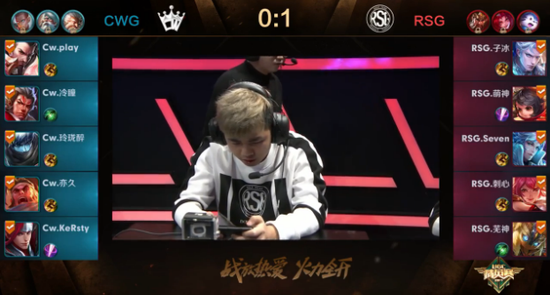 开局,RSG顺利拿下一血,并持续拉大优势,李元芳拿下对方红蓝BUFF,而CWG李白则始终无缘自家蓝BUFF。RSG扩大优势,拿下对方中上路各一塔并率先拿下第一条暴龙。而CWG则始终无法发育。比赛进入12分钟,RSG经济领先六千,诸葛亮与李元芳发育都很完美,打出这套阵容的优势所在,最终拿下总决赛第一局。MVP颁给Seven。