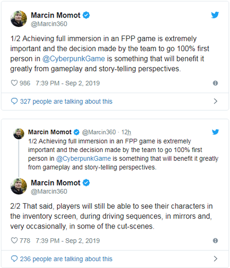 现在CDPR全球社区经理Marcin Momot在推特上表示,《赛博朋克2077》偶尔也会有第三人称视角出现,比如你在驾驶载具的时候,将是第三人称视角,而且你还能通过物品栏界面(inventory screen ),偶尔的少数过场镜头或是房间里的镜子,看见自己创建的角色真容。但《赛博朋克2077》是一款彻头彻尾的第一人称游戏,能让玩家有更好的沉浸式体验。