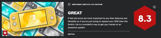 任天堂最新的便携式主机Switch Lite于9月20日正式发售,IGN在发售当日给Switch Lite暂定了8分的评分,今日(9月26日),IGN给Switch Lite打出了终评分数——8.3分。并表示新的掌机很棒,但是如果尺寸和价格对你来说比掌机/主机切换性和更大的屏幕更重要的话(或者如果你只是想给你的3DS找个替代品),那么Switch Lite绝对是你一个不二的选择。