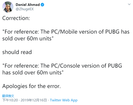 根据市场分析师Daniel Ahmad的报告,PC/主机版的《PUBG》销量已经突破6000万台,而根据官方2018年6月份的市场数据,当时的销量为5000万台。换句话说,在过去将近一年半的时间里,游戏的销量为1000万左右。