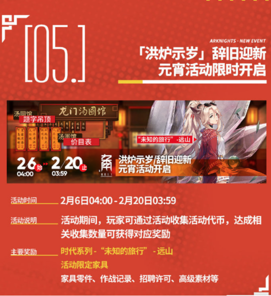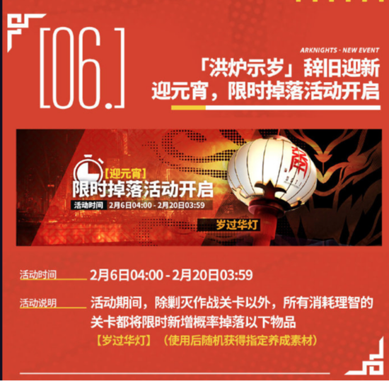 活动6,限时掉落活动。同样是在2月6日开放的活动,除了剿灭关卡之外,所有消耗理智的关卡都会新增掉落“岁过华灯”,打开道具能够随机获得指定养成素材。