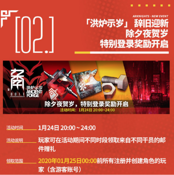 活动2,特别登录奖励,这一活动仅持续4小时,从1月24日20:00到24:00,不同时间段会收到不同干员的邮件赠礼。通过活动banne能够看出,奖励里面除了理智液、家具零件还有合成玉。