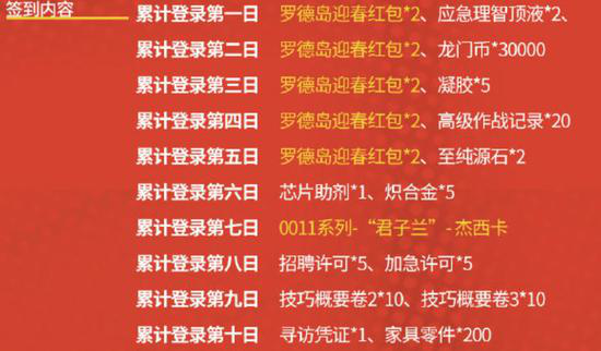 活动3,这个活动在1月25日4:00点才回开启,一直持续到2月8日的3:59,其实就是个签到活动,一点也不麻烦但奖励颇为丰厚。在规定时间内,累计登录10天中,每天都能够获得不同的奖励,在累计签到第七天会给杰西卡的新春皮肤。而这个签到活动最吸睛的当属“罗德岛迎春红包”,签到累计五天总共给10个,首次开启给800个合成玉,之后会从200、300、500、800四个数量中随机奖励,也就是说在这次活动中最高能够拿到8000玉,最低也有2600块合成玉。