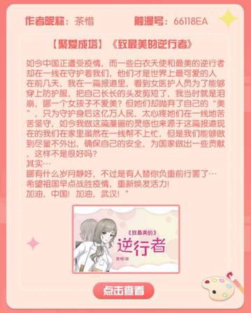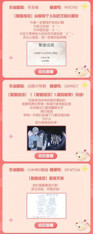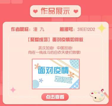 当前,新冠肺炎疫情防控形势依然严峻。2月17日,在“以笔为枪,抗击疫情”活动的基础上,触漫发起了“聚爱成塔”爱心漫画创作活动,号召触漫用户用漫画讴歌抗“疫”英雄,用作品声援武汉,传递更多的温暖与力量。