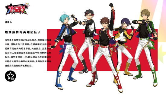 流星队隶属于STARMAKER PRODUCTION事务所,是由守泽千秋率领的正义战队组合,在制作人中人气很高。流星队的粉丝福利热诚丰厚。虽然五位团队成员个性迥异,但是他们每一个都独具魅力!