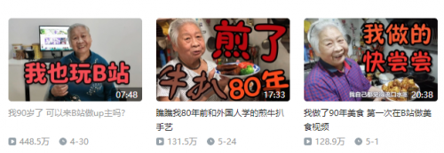 B站不久前也出了位90岁的高龄up主敏慈不老,第一个视频的播放量就超过了400万,大块大块的弹幕都刷着同一句“奶奶好”。