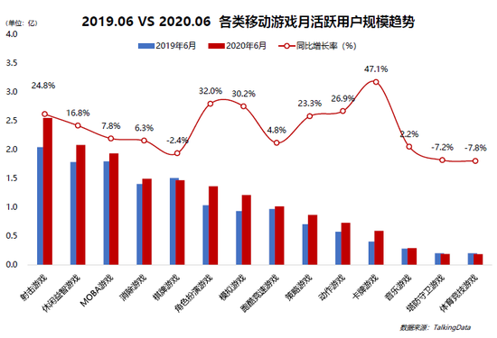 从用户所选择的游戏类型分布上看,射击游戏、休闲益智游戏和MOBA游戏已经成为行业三大主流市场,各自月活跃用户数量均在2亿左右。其中,以“吃鸡”为代表的射击游戏表现最为突出,截至今年6月,月活跃用户数量已经超过2.5亿,与2019年同期相比,同比增长高达24.8%。