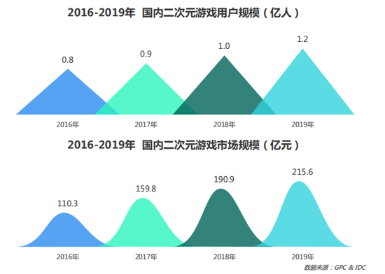 随着青少年用户购买力提升,以及二次元从原本亚文化地位向主流文化快速扩散,二次元移动游戏在市场上同样增量明显,数据显示,从2016年至2019年,国内二次元游戏领域无论玩家数量还是收入规模都保持稳定增长,市场整体趋势显著发展。这表明二次元消费群体正从“文化攫取”向“消费内容”进行转变。