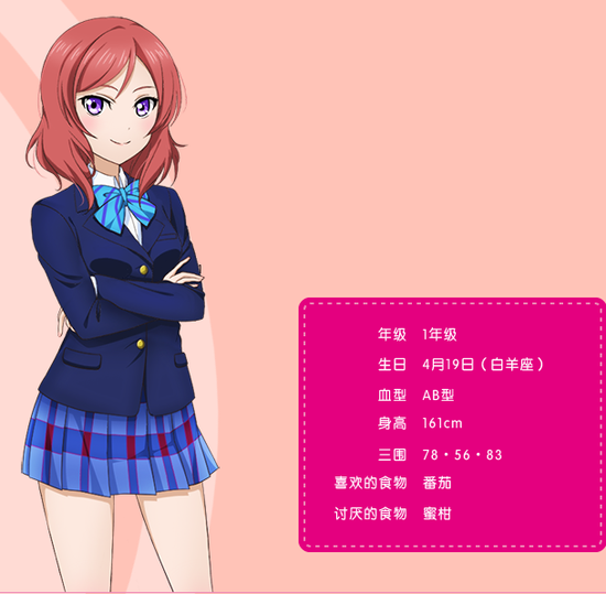 西木野真姬,15岁,高中一年级。真姬是一位父母双亲经营着大医院的富家大小姐。她的歌喉十分出众,而且会弹钢琴,是位备受期待的一年级生。真姬态度高傲且自尊心强,但本人不擅长表露真心。真姬天生胆识过人,与高学年相处时也很强势,但其实也有怕寂寞的一面。
