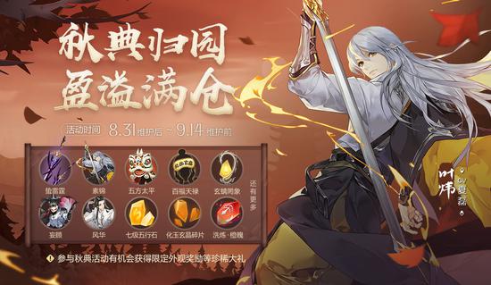 秋分已至,在这浓情金秋,更有江湖好礼相伴。少侠们购买[机缘礼包]获得消耗型趣味道具[寒冬遗冰]同时附赠少侠不同数量的[金秋笺];此外,少侠参与[名剑大会][江湖论剑][阵营战场][大师赛]也可抽卡获得[金秋笺]奖励!