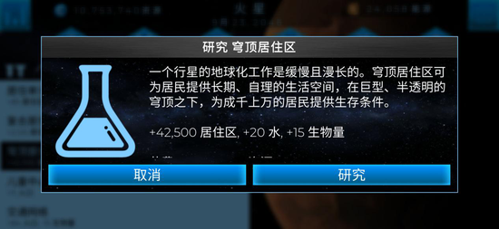 在初期时可以直接研究最高级建筑,比如直接研究到彗星制导系统,就可以大量造水,不用浪费资源在前两个建筑上。同理,住宅区也直接建穹顶,1级穹顶能顶十几个V级居住中心。