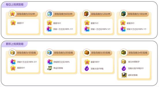 9月23日至10月20日,接取[冒险岛接力]和波波玩耍,领取登录奖励吧!任务,达到对应的条件,可以获得每日上线奖励和累积上线奖励。