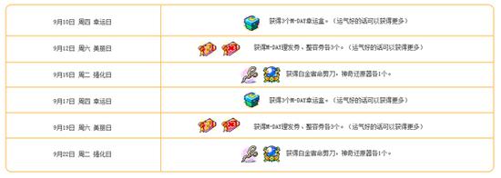 9月9日起至9月22日,玩家可接取[M-DAY]M-DAY的开始任务,每逢星期二、四、六全天(00:00~23:59)开启M-DAY活动,将当日RISE条全部填满后即可享受不同的优惠福利。