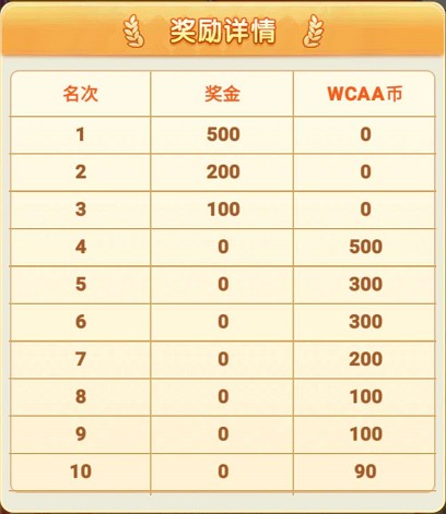 第4-30名玩家将直接获得WCAA币奖励(WCAA币可用于在WCAA商城兑换实物礼品)