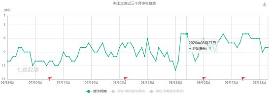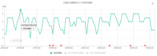 与此同时,去年9月份上线的《三国志·战略版》在上线后也一直维持着大热的姿态,到目前已经在市场头部稳坐了一整年的时间。同样以过去3个月游戏在国内App Store畅销榜的排名来看,《三国志·战略版》不仅一直保持在TOP10之内,而且大部分时间都能稳守在TOP3附近,在7月份游戏更是一度登上了榜首的宝座。