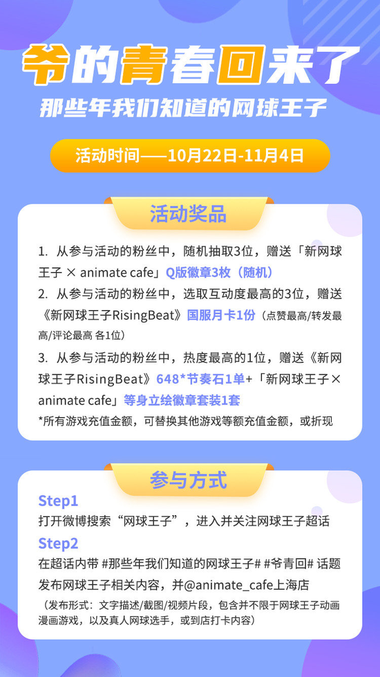特别提醒,无论是新网球王子的主题餐厅,还是微博超话活动,到11月4日就全部结束了哦!活动门槛低,活动时间紧,是要中大奖的感觉!如果不想错过现场体验的机会,抓紧去B站会员购,搜“animate café”预约吧~~