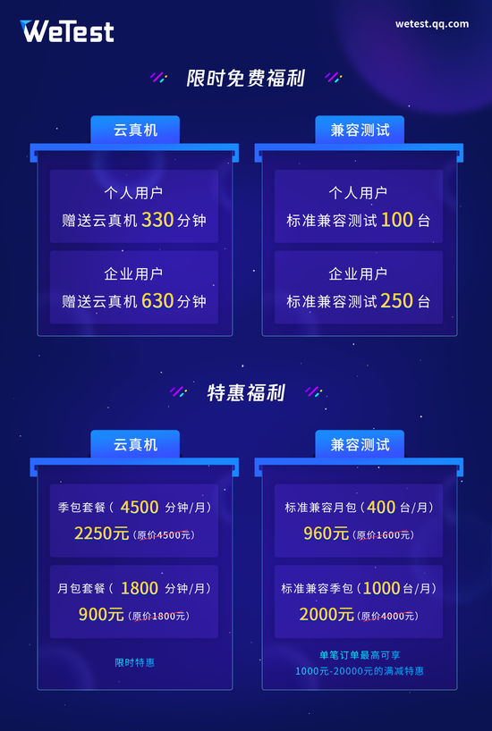 WeTest作为一站式质量测试服务平台,产品已经涵盖兼容测试、云真机、性能测试、安全测试、舆情分析等多个领域,助开发者们攻克“人员、设备、流程、工具、环境”五大难题。WeTest与用户一路互相选择,互相成就。为了感谢广大开发者们一直以来的陪伴与支持,WeTest在五周年庆期间推出了一系列诚意满满的福利回馈。