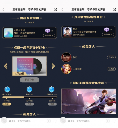 虽然“王者共创荣耀盛典”已在乐迷欢呼声中落下帷幕,但对于王者荣耀的玩家们而言,QQ音乐一直是他们听歌交流的第一阵地。早在去年,QQ音乐就已与王者荣耀开启深度合作,为王者荣耀四周年打造“千灯之约”线上主题活动,唤醒无数玩家的峡谷记忆。今年五月,QQ音乐更携手王者荣耀上线“无限王者周”,不仅接连打造无限王者团、张杰音乐站等丰富音乐内容,更送出限量皮肤、铭文等专属好礼,为玩家和乐迷们创造了难忘的游戏音乐记忆。