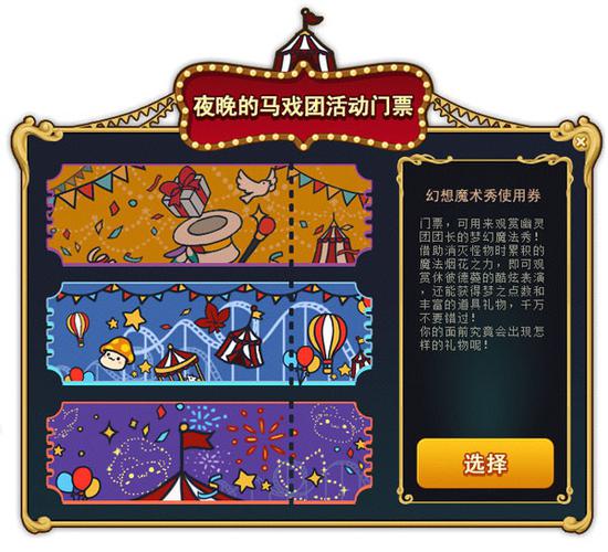 活动期间,通过NPC休彼德蔓可以获得夜晚的马戏团活动门票使用券,幽灵团准备了3种不同形式活动,玩家可以每周选择进行其中1个活动。选择后该周无法进行其他活动。