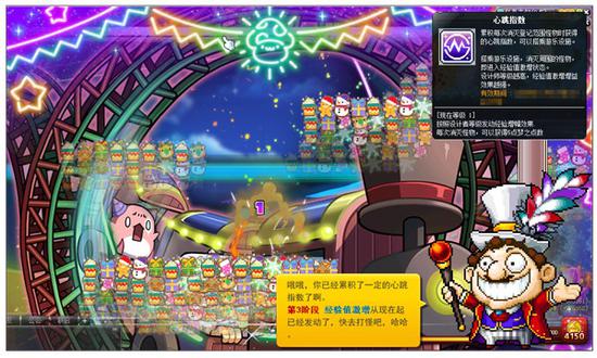 11月4日至12月1日,玩家可通过夜晚马戏团活动门票选择畅想游乐设施活动,获得心跳指数技能,消灭等级范围内怪物,累积心跳指数,凭借这个胆量去享受游乐设施,获得梦之点数和丰富的经验值增益加速福利。