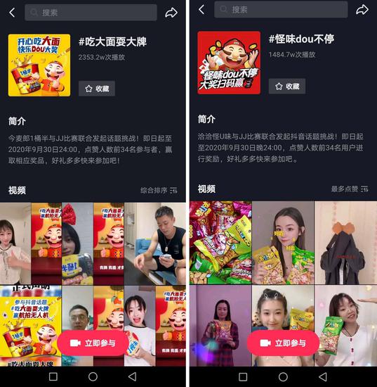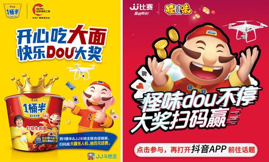 百搭跨界为激发今麦郎与洽洽的品牌活力,推动JJ比赛手游分发,在抖音平台上分别发起“#吃大面耍大牌与#怪味dou不停”的话题挑战赛。