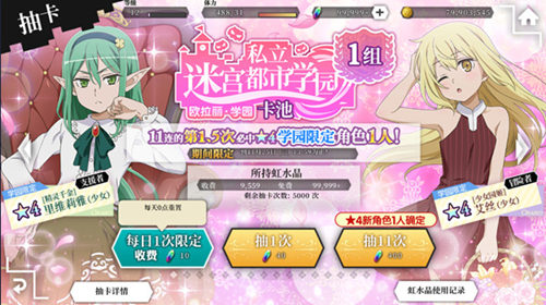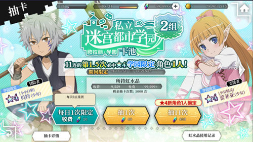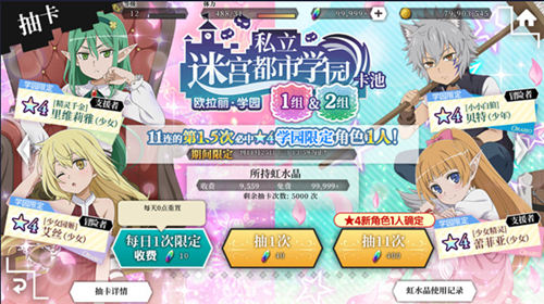 私立迷宫都市学园活动上线期间,将上线2大限定卡池。每组卡池11连抽的第1、5次必中期间限定⭐4角色1人!没有抽到心仪的角色?没关系!在学园限定的混合卡池中,冒险者大人们扔可以通过11连抽,在第1、5次必中期间限定⭐4角色。希望各位冒险者大人都能变成欧皇哦!