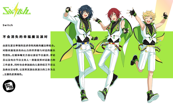 音乐组合Switch隶属于事务所NEW DIMENSION,是由逆先夏目率领的追求奇特风格的魔法师组合。Switch对粉丝展现具有向心力的世界观与对话的娱乐性团队,奇特的风格吸引了一大批忠实的粉丝。