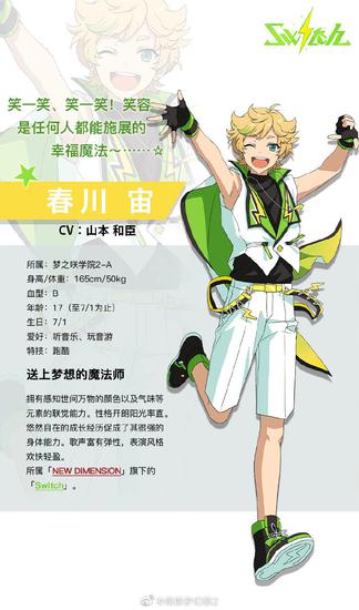 17岁的春川宙目前在梦之咲学院2-A班就读,身高165cm,体重50kg,血型B型,生日是7月1日。春川宙拥有着一头卷曲反翘的金色短发,让人觉得活力十足。他拥有着圆圆的蓝色眼瞳,粗短的眉毛,看起来天然又可爱。春川宙的性格开朗阳光率直,悠然自在的成长经历促成了其很强的身体能力。