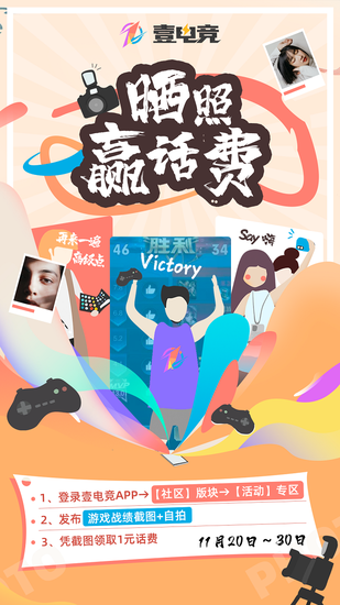 11月20日~30日,登录壹电竞APP[社区]版块,晒出你的游戏战绩截图+自拍,秀出自信和风采,就能领取壹电竞发放的话费补贴,活动同样持续11天,早秀早拿哟,小编在壹电竞等你们~