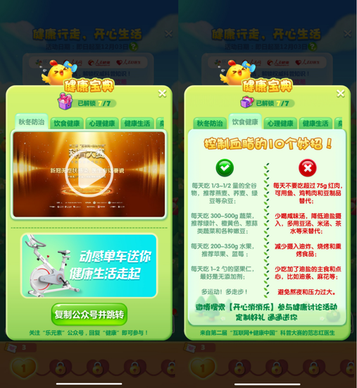响应 “健康中国”号召,乐元素作为支持单位,与人民网·人民健康共同助力人民好医生2020“互联网+健康中国”第二届科普大赛,在旗下经典消除游戏《开心消消乐》发起了这次走步公益。现在起,关注“乐元素”微信公众号,就有机会赢取动感单车、空气炸锅、智能跑步机、健康大礼包等好礼,一起来参与吧~
