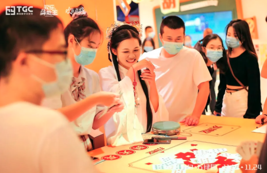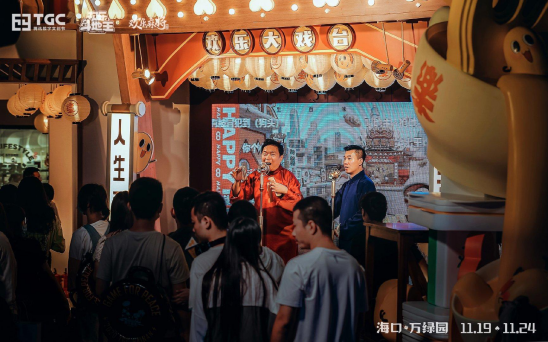 相较过去,数字化升级是欢乐茶馆在今年的一个亮点。在现场,茶馆运用了音乐、灯光、大屏,从而通过实时的声光电特效来营造沉浸式的感官体验。值得一提的是,欢乐茶馆还是 TGC 上第一个实现 IP 场景线上线下打通体验的头部 IP。