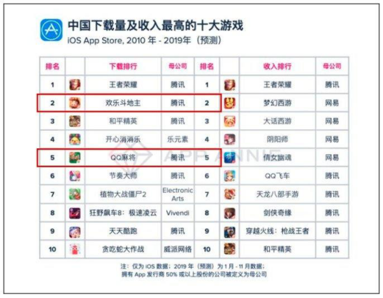 与大多数游戏不同,棋牌游戏往往受众广泛,且用户稳定性高。在2019年,App Annie 曾回顾过去十年最受欢迎的国产游戏,其中《欢乐斗地主》与《QQ 麻将》均位列下载榜 Top 5。