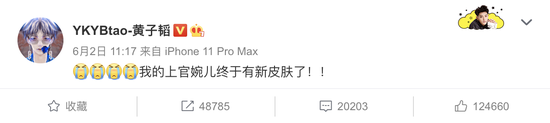 仔细翻翻,还有好多公开为王者荣耀站台而成为热点的明星,比如王者荣耀人气英雄上官婉儿KPL限定皮肤上线时,黄子韬就曾在微博激动高呼“我的上官婉儿终于有新皮肤了!!”。