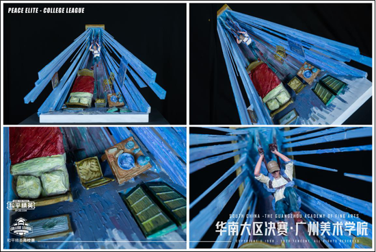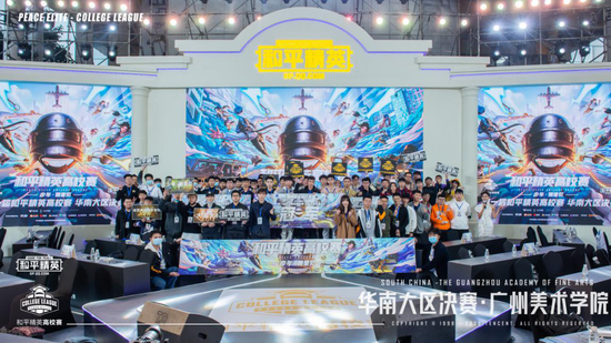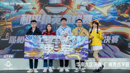 本次和平精英高校赛华南大区决赛,落地广州大学城活动广场。活动现场则以艺术展览馆风格呈现并展出共创作品,赛展合一,打造了首个大吉大利电竞艺术展。