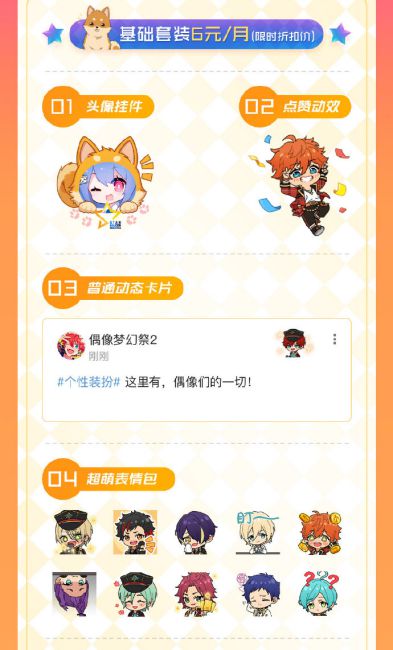 基础套装限时折扣仅需6元1个月,内含头像挂件、点赞动效、普通卡片动态和超萌表情包。