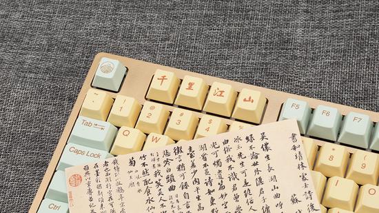 达尔优A87千里江山机械键盘赭石色机身搭配青绿键帽让键盘看起来蓬勃大气,空格、回车、退格等键位上的山水画纹路,与“千里江山”的主题更加契合,让人仿佛置身于“千里江山”画作中山水之间。键盘的F1~F4键位用书法字体写出了“千里江山”四字,仿佛画卷上的名章一样,非常适合追求个性的主流玩家选择。