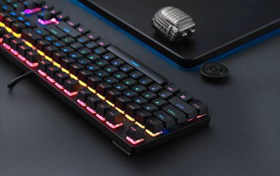 这款键盘采用了标准104键布局设计,整体简约朴素,时尚靓丽,视觉效果十分出色,颜值很高。搭载电竞级高特机械轴体,拥有高达5000万次使用寿命,触发迅速,反馈清晰,能为玩家提供稳定的游戏保障。