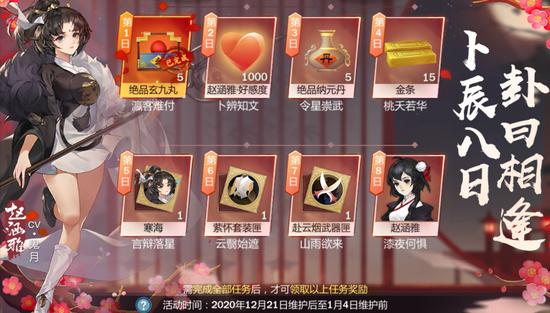 九天少女赵涵雅即将上线啦!占卜八日,卦约相逢。12月21日维护后-1月4日维护前,少侠每日可完成一段[赵涵雅]相关任务,完成全部八段任务后,方可一次性领取本次活动全部奖励。