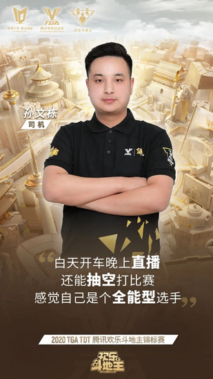 在今年的总决赛开始之前,TDT特意为晋级的选手制作了态度海报,海报着重凸显了这些选手身上草根的一面。白天开车晚上直播的司机、从工友里走出的棋牌高手、年长却自信的个体户、将兴趣转变成职业的职业选手……各式各样的职业加上朴素的外表成了TDT全民化最好的注脚。