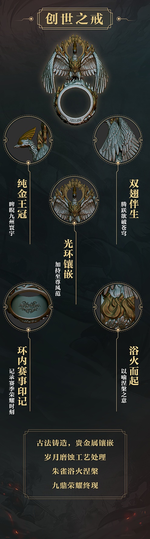 在过去的五届赛事中,《乱世王者》分别采用了青龙、白虎、麒麟、鲲鹏作为冠军戒指的设计灵感,它们是中国传统瑞兽,是华夏传说中的强者,这与《乱世王者》中的王者不谋而合。S6延续了这个传统,再次将视野放到了宏大的华夏上古传说中,以真灵朱雀为灵感之源打造全新冠军戒指,更与全新冠军王城皮肤相呼应。