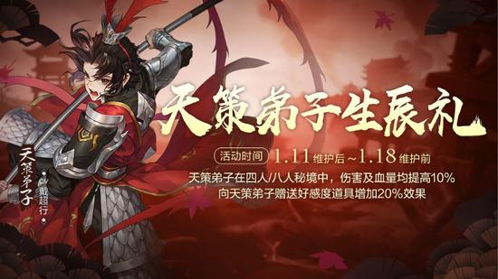 生辰礼活动期间,四人/八人秘境中,[天策弟子]及[杨宁]的伤害及血量将提高10%;活动期间,向[天策弟子]及[杨宁]提交好感度道具,获得的好感度将提升20%。