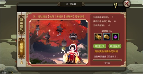 开门见喜包含“新年赠礼”和“福缘树”两个活动,玩家通过完成日常活动获得拼图碎片,集齐所有的拼图碎片可获得超值奖励。玩家通过拼图任务可以额外获得[桃符]用来升级[大树],将大树升至指定级数可获得全服奖励。