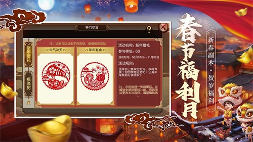 春节前后游戏将重新开启去年陪伴大家度过了一段艰难岁月的新春限时副本,神龙天火及元宵灯会,第一阶段开启神龙天火副本,第二阶段会关闭神龙天火副本转而开启元宵灯会副本。