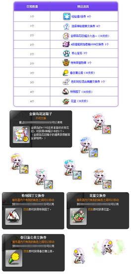 温暖的春天到了,来帮助卡米拉收集闪耀花瓣,在村里举办花朵庆典吧!3月24日起至4月6日,接取[花朵庆典]卡米拉花朵庆典,消灭等级范围内怪物可以收集闪耀花瓣,收集100个闪耀花瓣即可获得1个花笺,使用花笺可以在卡米拉的花笺商店兑换精品道具!
