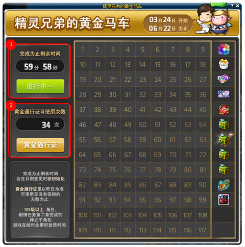 3月24日至6月22日,打开精灵兄弟黄金马车签到界面,每日累积在线时间1小时,通过完成按钮累积签到。盖上签到图章,即可获得大量礼物哦~
