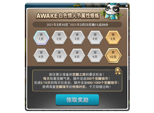 3月3日起至3月23日,完成[AWAKE]觉醒时间引导任务的玩家可接取白色情人节属性修炼任务,每天集齐全部觉醒气息后,可以在NPC萧公处领取白色情人节属性修炼奖励,在第5天和第10天可以获得更多觉醒铸币奖励哦!